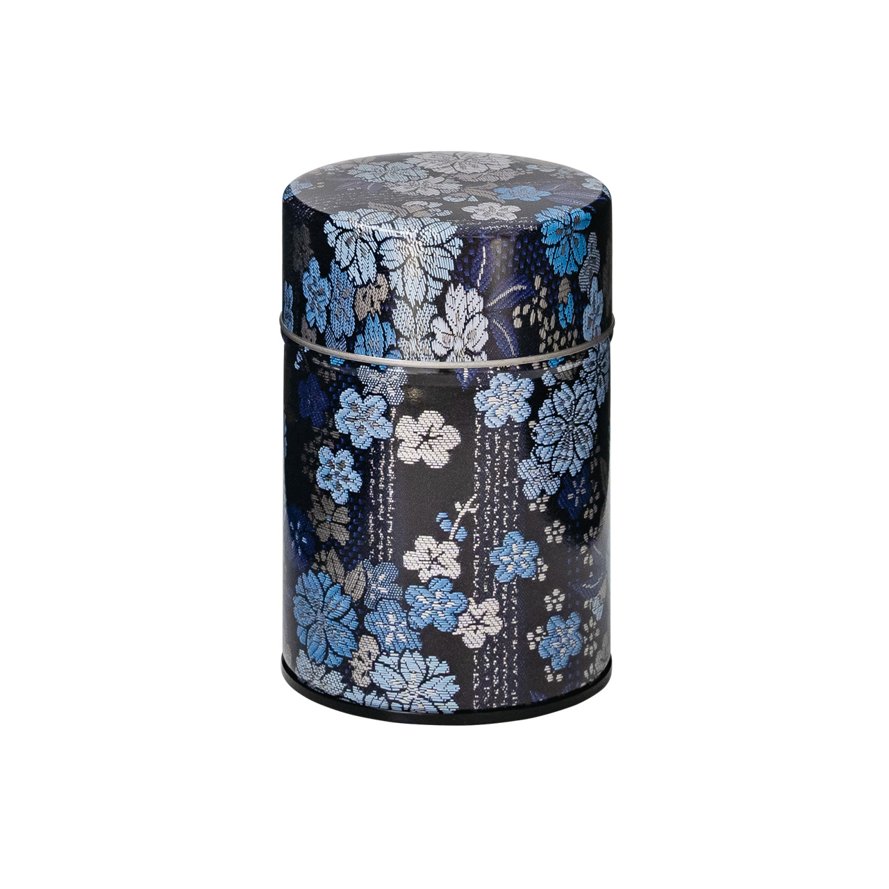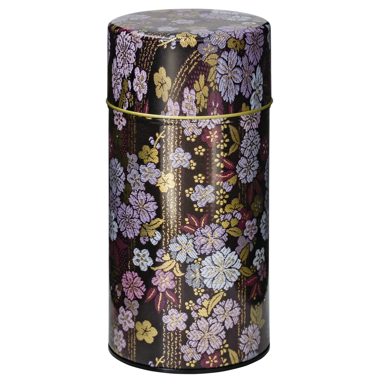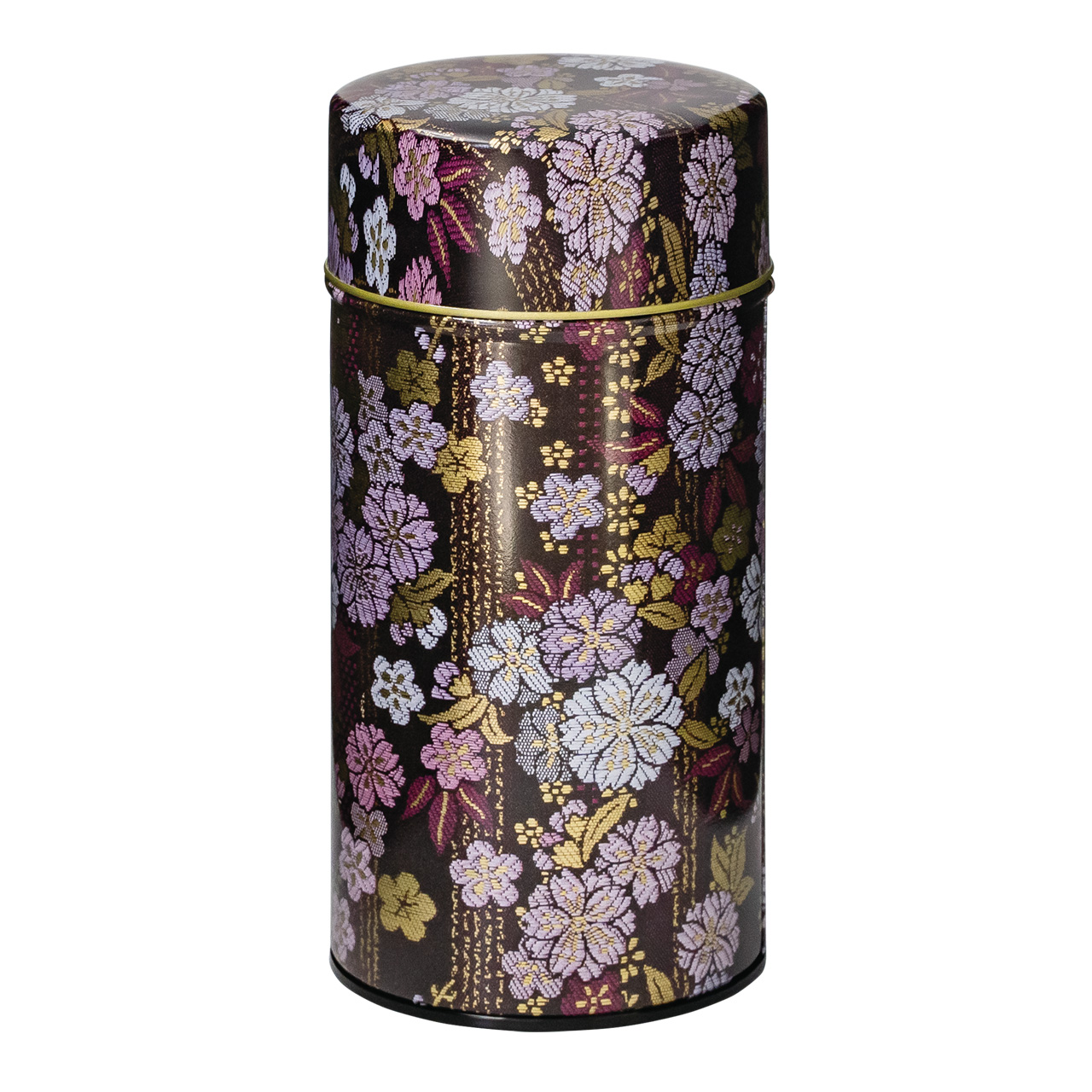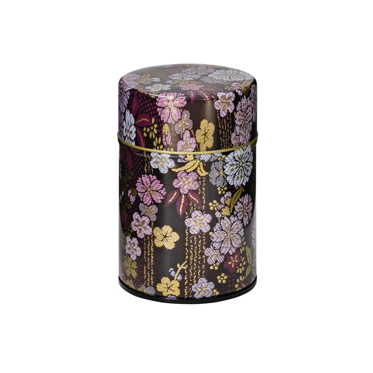 紋織物のひとつです。紫や藍色の配色が目を引く縦縞地紋の梅桜柄を缶で再現しました。