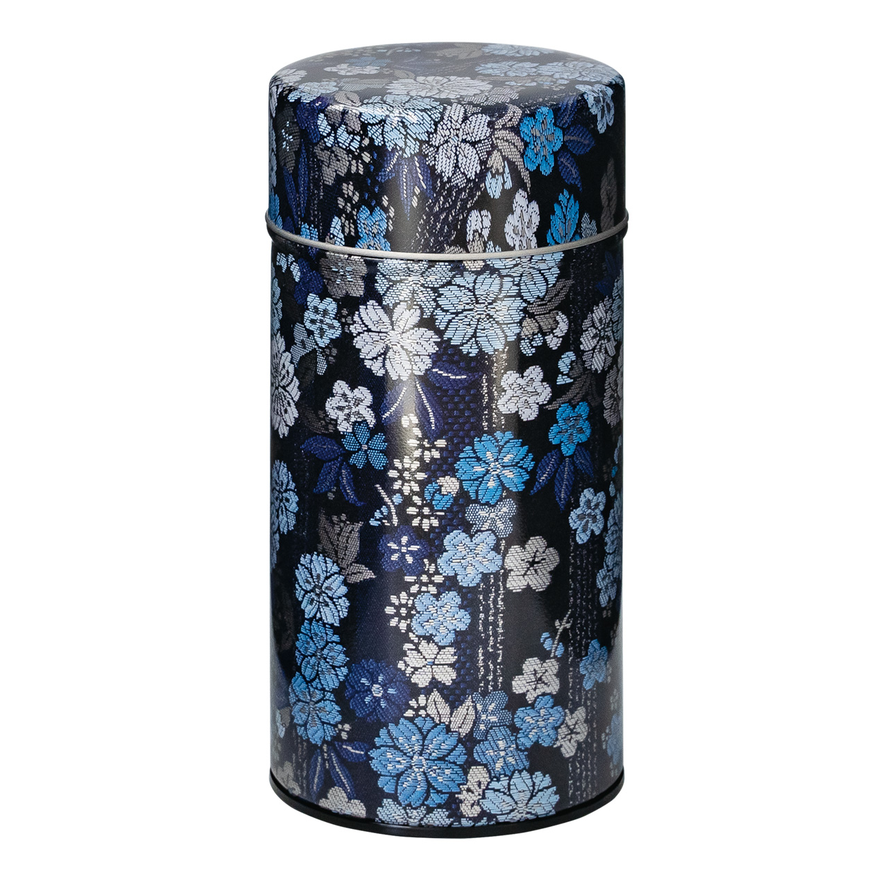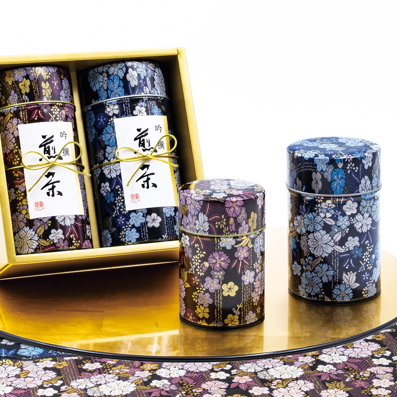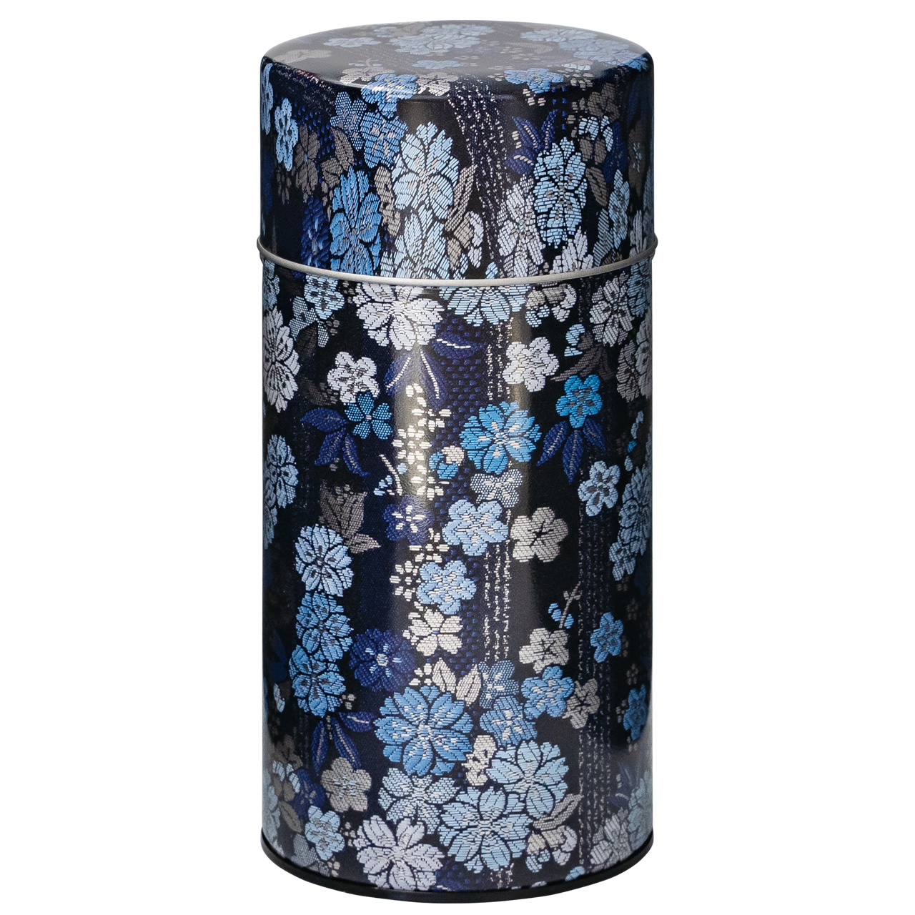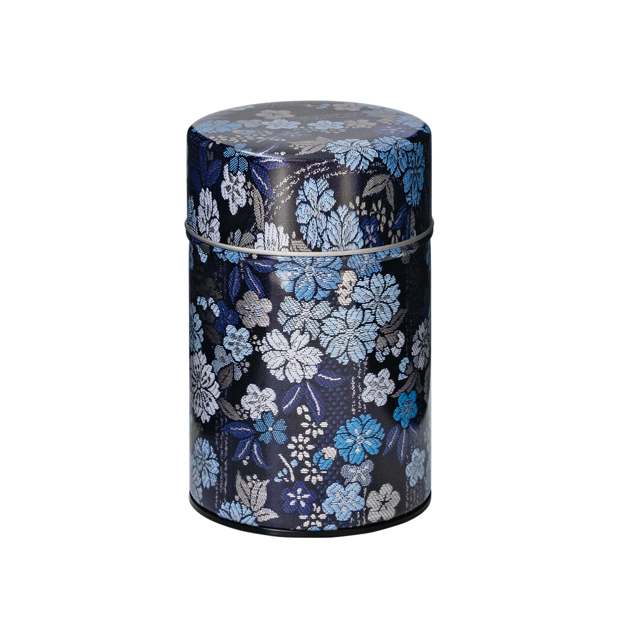 紋織物のひとつです。紫や藍色の配色が目を引く縦縞地紋の梅桜柄を缶で再現しました。