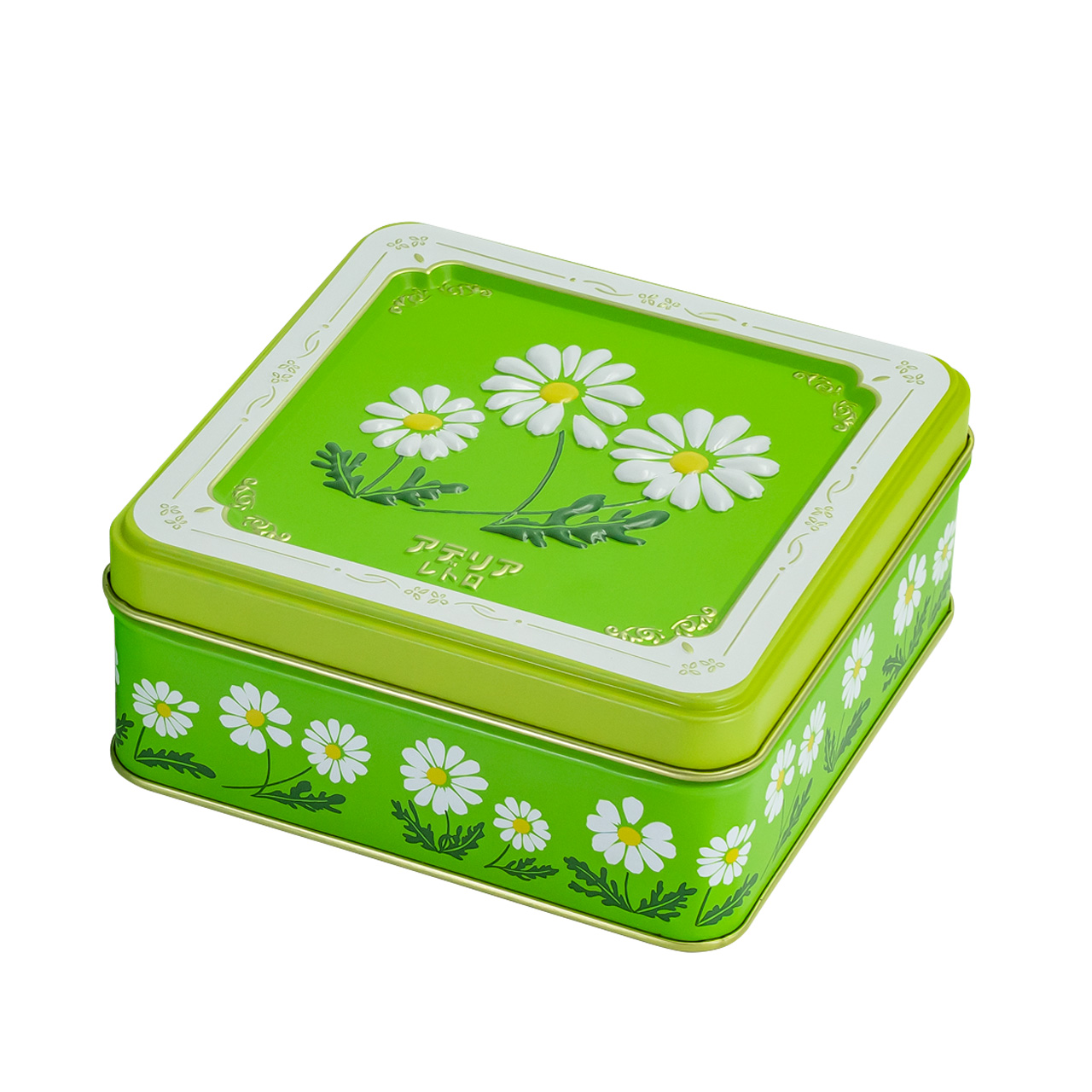 カートン付き アデリアレトロ×NITTOHキャニスター缶 <野ばな>aderia retro x nittoh 昭和のかわいいを詰め込んだ「アデリアレトロ」と、缶メーカー「日東産業」がコラボレーションしたブリキ製のキャニスター缶(保存容器)です。 デザインは数あるアデリアレトロの中でも人気の<野ばな>。エンボス加工で立体的に表現した「野ばな」、その周りをメタリックゴールドで装飾した「かわいい」に金属容器ならではの高級感をプラスするように仕上げました。 [缶の種類・形状] 印刷缶 / 角型 [デザイン] 和風 / 洋風