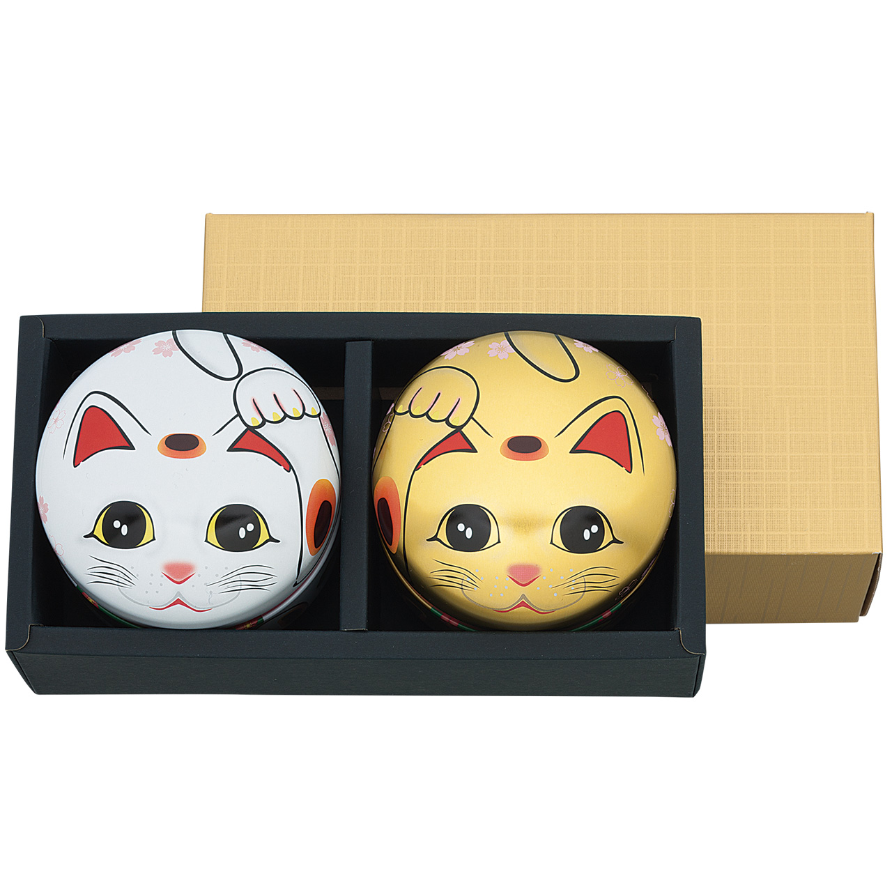 金 白 セット例(鈴子×2) 鈴子 招き猫suzuko-manekineko 招き猫は江戸の昔よりお金や人を招いてくれる縁起物として親しまれてきました。 右手を挙げている招き猫は金運や幸運を招き、 左手を挙げている招き猫は千客万来といってお客様を招くと言われています。 商売繁盛、開店祝い、結婚祝い、定年祝いなど幸運が訪れるよう願いをこめて… 贈り物や自分使いにいかかでしょうか。 [缶の種類・形状] 印刷缶 / 丸型 [デザイン] 和風 / 鈴子