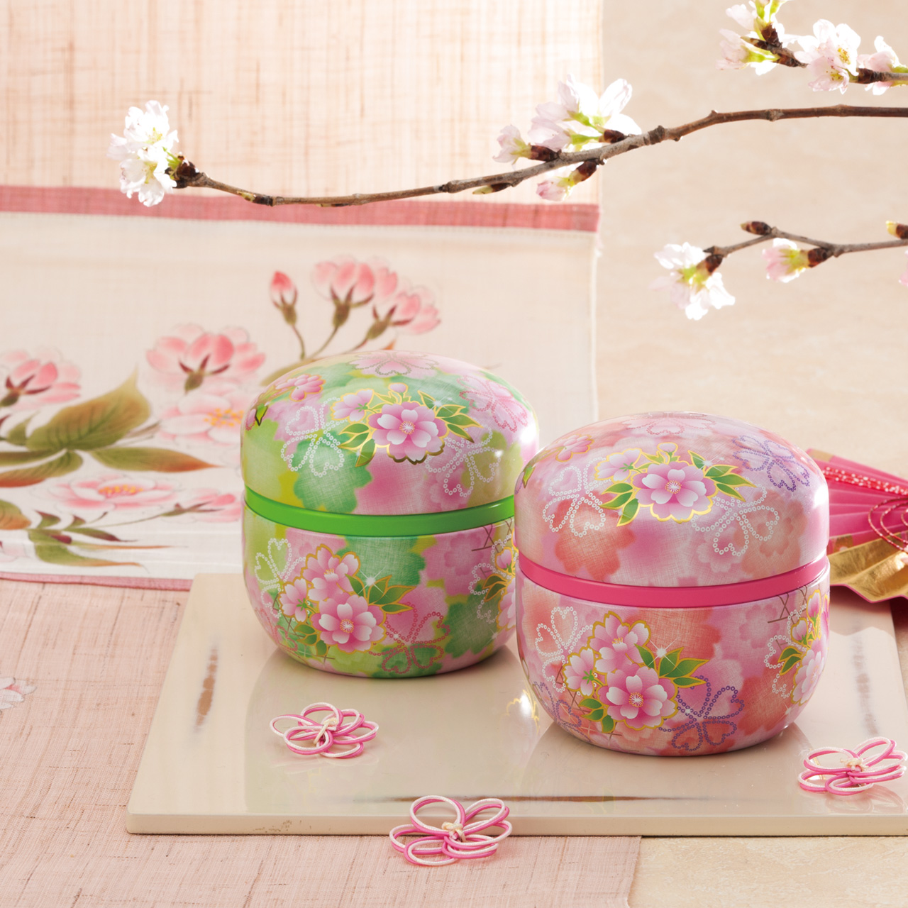 グリーン ピンク セット例(鈴子×2) 鈴子 ひよりsuzuko-hiyori 春の晴れたぽかぽか日和 桜の花が爛漫に満ち、春の宴の様子をイメージしてます。 季節の贈り物として喜ばれそうです。 [缶の種類・形状] 印刷缶 / 丸型 [デザイン] 和風 / 鈴子